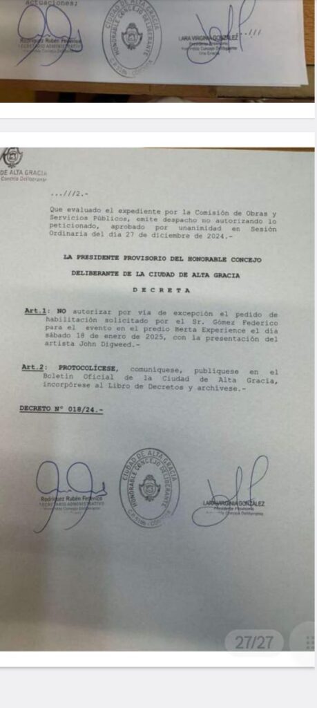 Este pedido fue rechazado por el Concejo Deliberante de esa ciudad bajo el argumento del exhorto judicial, y el municipio a través del decreto 018/24 rechazó el pedido no autorizando la concreción de la misma.