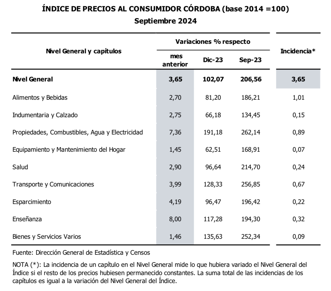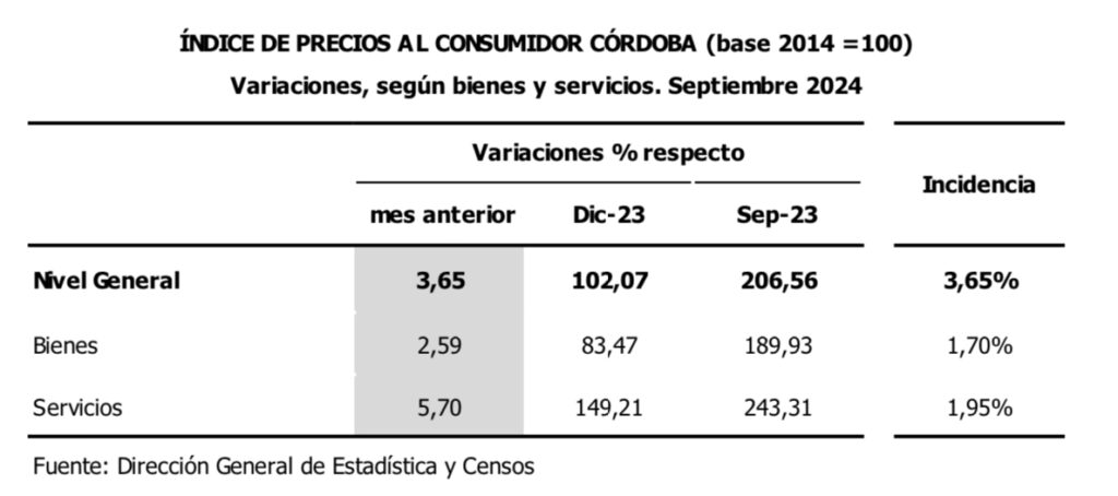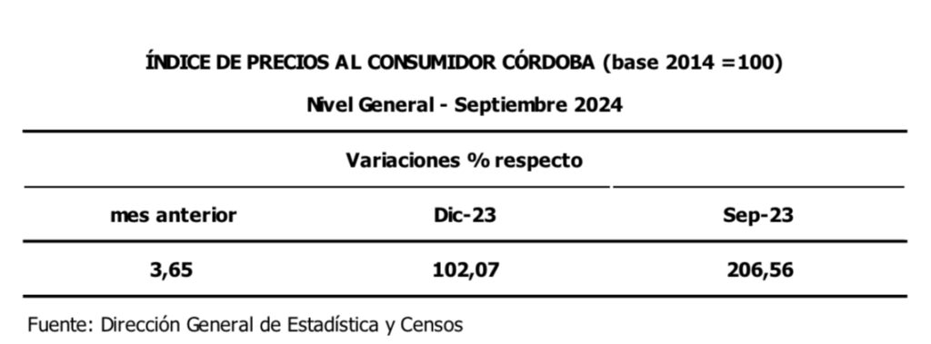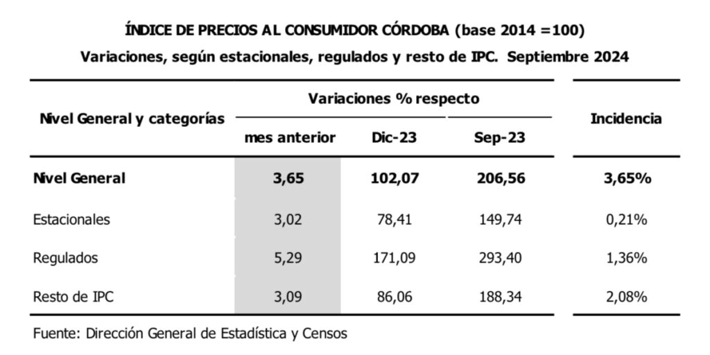 Durante el mes de septiembre de 2024, el Índice de Precios al Consumidor Córdoba (IPC-Cba) registró un incremento en su Nivel General de 3,65% respecto al mes anterior.