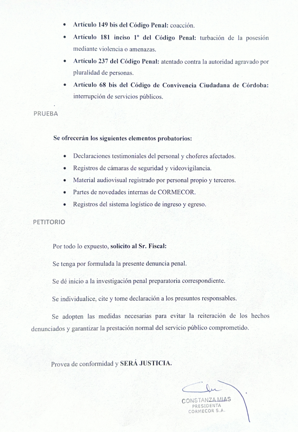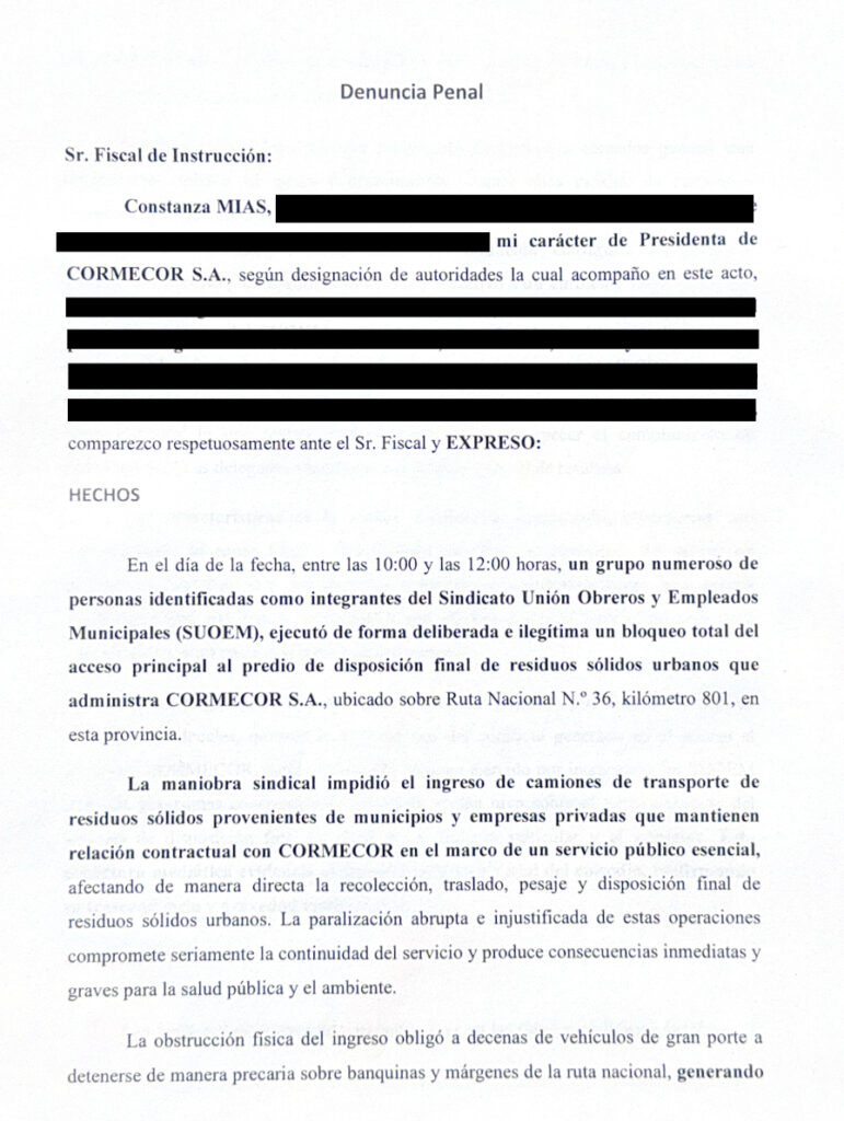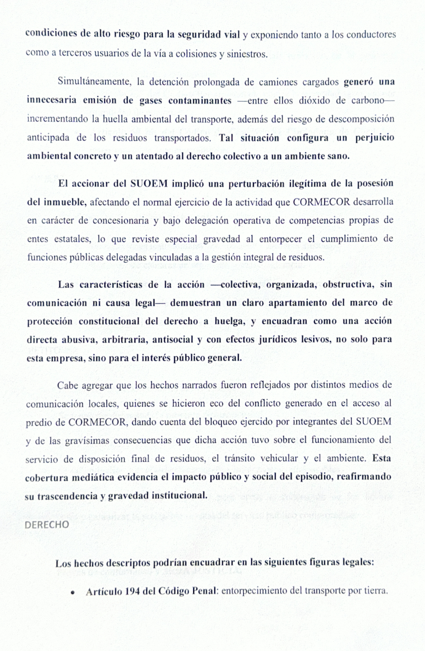 Ante el bloqueo ilegítimo del principal acceso al predio de disposición final de residuos de Piedras Blancas, y por instrucciones de la Municipalidad de Córdoba en acuerdo con el Ente Metropolitano, CORMECOR denunció penalmente al Sindicato Unión Obreros y Empleados Municipales (SUOEM). La acusación fue radicada en la Unidad Judicial N° 23 de la ciudad de Córdoba.