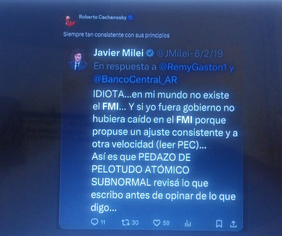 En el mismo contexto y por el mismo tema Milei insultaba por la red X a Roberto Cachanovsky, el economista neoliberal que defendía el primer endeudamiento de Caputo: