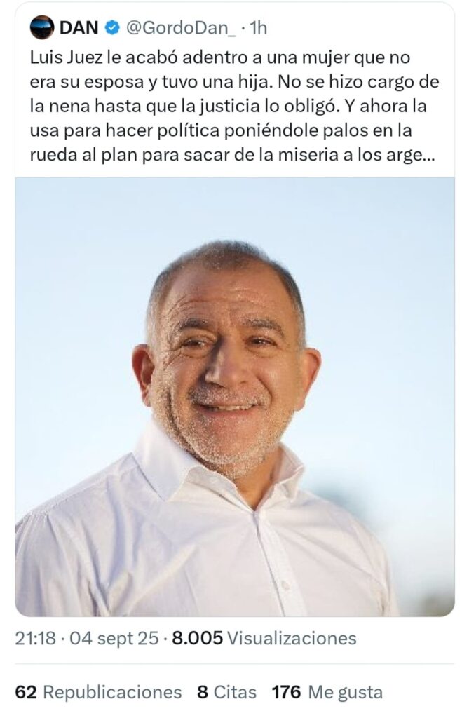 El mensaje de Parisini fue una reacción al voto de Juez en el Senado, donde el legislador cordobés apoyó el rechazo al veto presidencial a la Ley de Emergencia en Discapacidad. En un tono agresivo y cargado de referencias personales, Parisini escribió: “Luis Juez le acabó adentro a una mujer que no era su esposa y tuvo una hija. No se hizo cargo de la nena hasta que la justicia lo obligó. Y ahora la usa para hacer política poniéndole palos en la rueda al plan para sacar de la miseria a los argentinos del presidente Milei”. El comentario, considerado grosero y discriminatorio, generó una inmediata indignación en redes sociales y en el arco político.