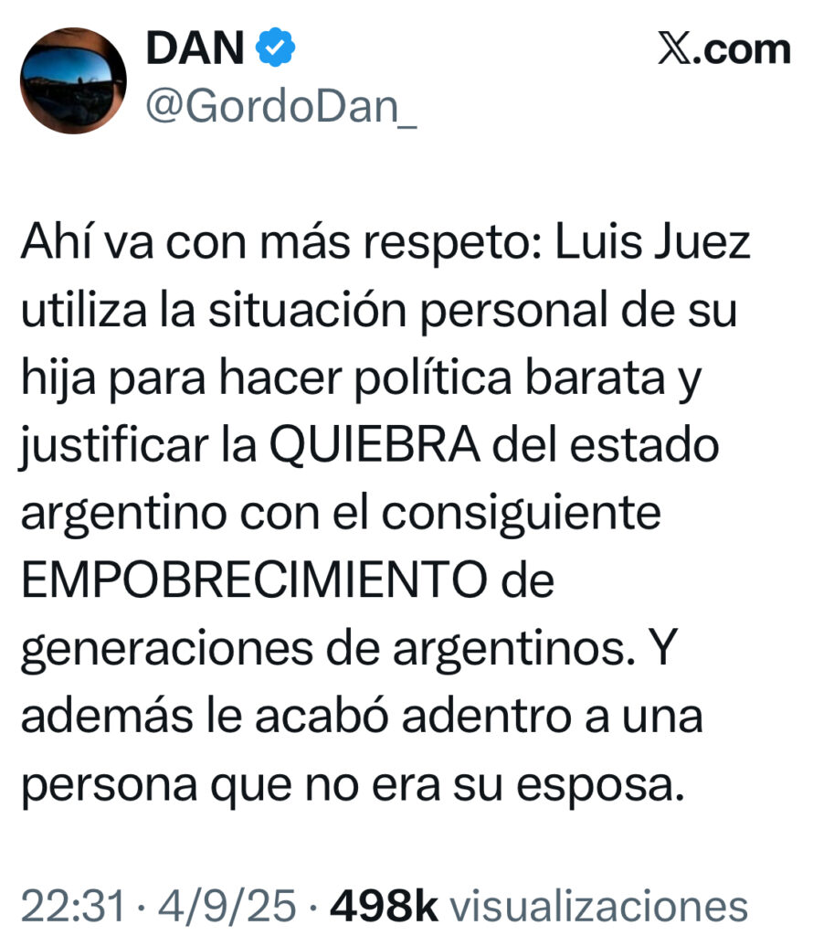 Un nuevo escándalo sacudió el ámbito político argentino tras un ofensivo mensaje publicado en la red social X por Daniel Parisini, conocido como “Gordo Dan”, un influencer libertario cercano al oficialismo. El posteo, dirigido al senador nacional del PRO Luis Juez y su hija Milagros, quien padece parálisis cerebral, desató una ola de repudios y puso en evidencia las tensiones dentro del espacio político alineado con el gobierno de Javier Milei.