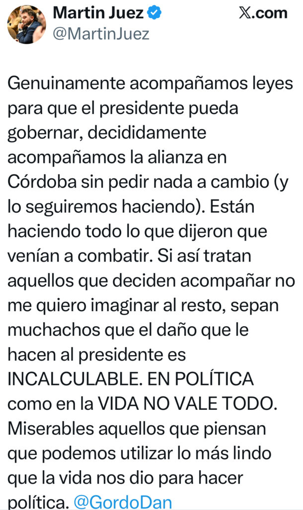 Mientras tanto, Luis Juez no se pronunció directamente sobre el comentario, pero su hijo Martín reposteó un mensaje en X defendiendo la postura de su padre: “Genuinamente acompañamos leyes para que el presidente pueda gobernar y la alianza en Córdoba sin pedir nada a cambio. Están haciendo todo lo que dijeron que venían a combatir”. El escándalo, ocurrido a días de las elecciones bonaerenses, añadió un nuevo capítulo a las tensiones entre el gobierno y sus aliados, dejando en claro que, como afirmó Francos, “no hay disculpas” para este tipo de exabruptos.