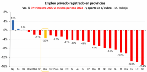 El gráfico del Ministerio de Trabajo deja una foto contundente: en el tercer trimestre de 2025, comparado con 2023, el empleo privado registrado cae en la enorme mayoría de las provincias. Apenas dos distritos muestran números positivos (Neuquén con +4,4% y Tucumán con un leve +0,2%), mientras el resto exhibe retrocesos que en algunos casos superan los dos dígitos. El promedio nacional ya es negativo y confirma un cambio de tendencia que no puede leerse aislado: es el último capítulo de una historia más larga que atraviesa distintos gobiernos y modelos económicos.