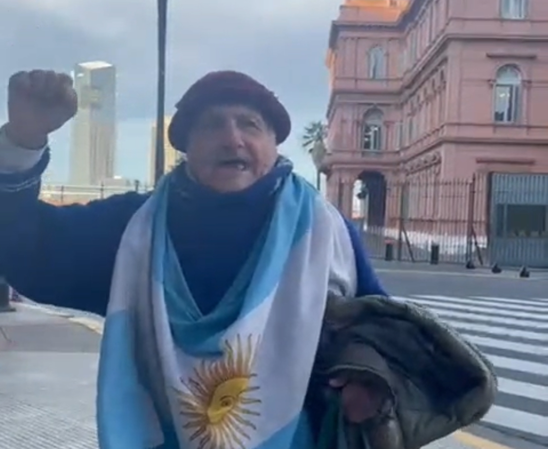 ”Viva Córdoba, viva el señor gobernador Llaryora que le ha dado 700 mil pesos a los pobres jubilados, los que estamos en Buenos Aires ganamos 300 mil”, se le escucha decir al hombre que envuelto en una bandera argentina lo grita frente a la casa Rosada.