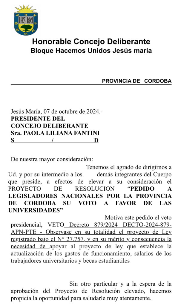 En la ciudad De Jesús Maria, los concejales del bloque Hacemos Unidos por Jesús María elevaron un proyecto para tratar en la próxima sesión un pedido para que los Diputados Nacionales por Córdoba, entre ellos el coterráneo Luis Picat, voten en contra del veto presidencial a la ley de financiamiento educativo.