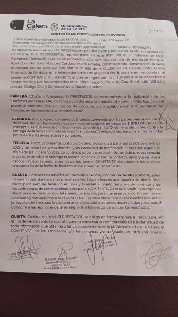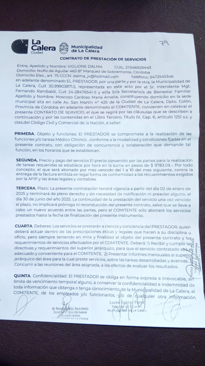 Por otro lado, las miradas apuntan directamente contra el intendente Rambaldi y los doctores Ricardo Iván Condorí y María Amelia Moscoso Cardozo quienes figuran como firmantes en el nombramiento de Ríos, quien no tiene ningún tipo de título habilitante ni presentó certificado de haber ejercido legalmente la medicina en otro sitio y de Dalma viglione quien tendría el número de matrícula de otro profesional, información que le fue entregada por el Consejo de Médicos de la Provincia de Córdoba a los responsables municipales.