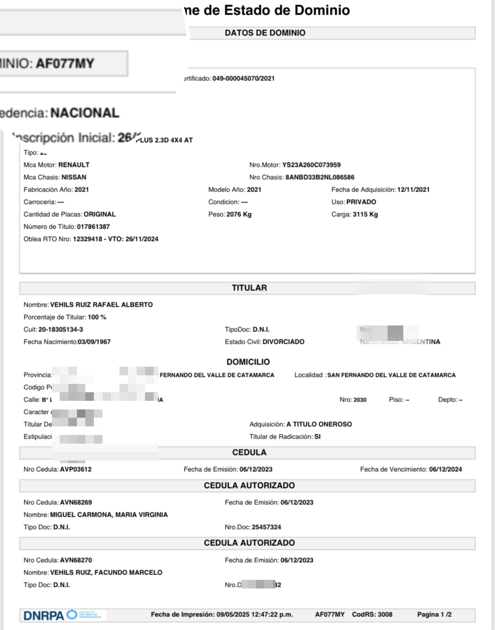 Si, de un fiscal federal de la provincia de Catamarca, Vehils Ruiz Alberto y como autorizados a manejar figuran, su hijo quien fuera noticia en la pandemia por violacion sistemática de las restricciones y de una fiscal de Bell Ville.
