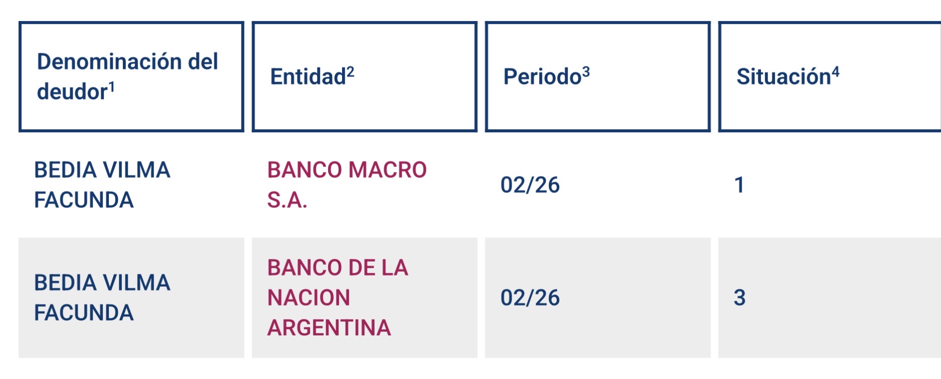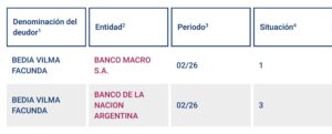 Según un registro del Banco Central de la República Argentina, Vilma Facunda Bedia aparece vinculada a créditos en el Banco Macro y en el Banco de la Nación Argentina. En ese informe, correspondiente a febrero de 2026, se detalla una situación dispar: mientras en una entidad figura en situación 1 (al día), en otra aparece en situación 3, lo que implica atrasos en los pagos.