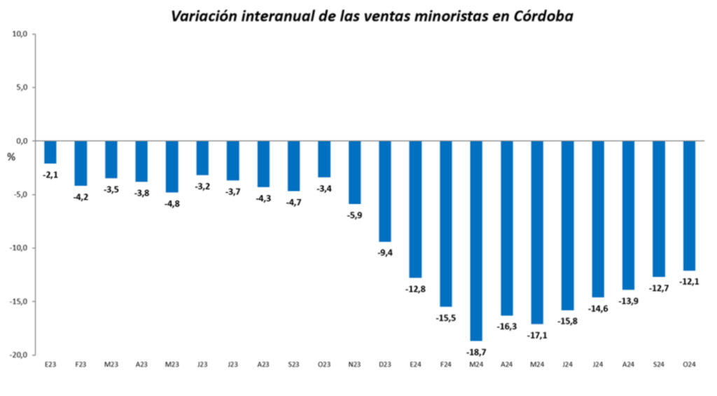 Las ventas minoristas de las pequeñas y medianas empresas comerciales en Córdoba finalizaron octubre con una disminución del 12,1% en comparación con el mismo mes del año anterior.