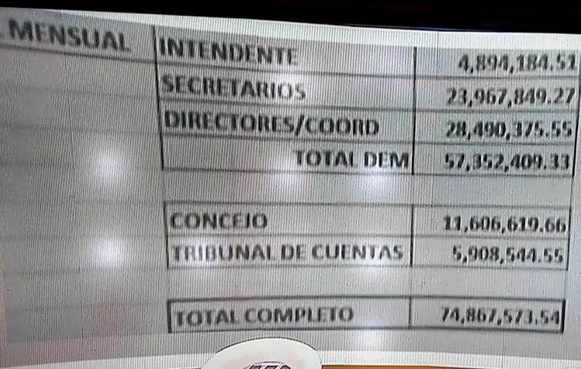 A lo que se le suma la remuneración que perciben los concejales cerca de $ 1.500.000 cada uno (son 7) que arroja la cifra de $ 11.606.619,66.