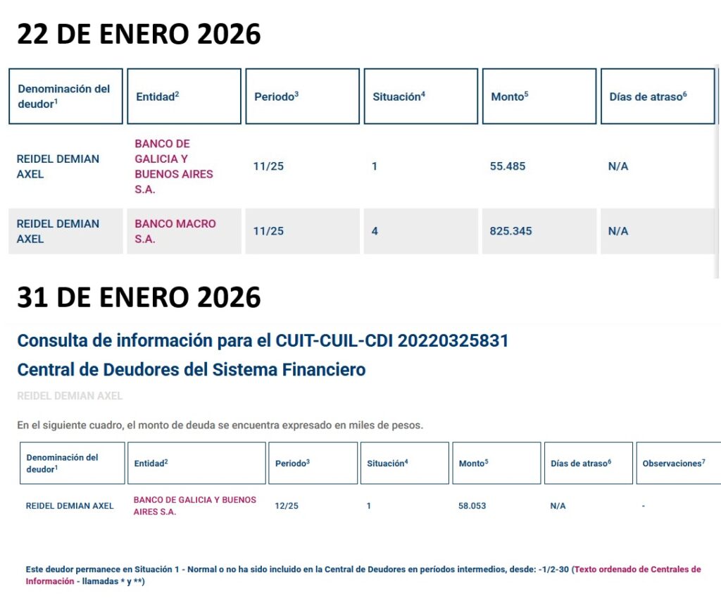 Según se reveló y consta en informes oficiales del Banco Central, al 12 de enero Reidel mantenía pasivos millonarios —principalmente con el Banco Macro—. Apenas 18 días después, esas deudas desaparecieron por completo. En particular, se habría cancelado una obligación de 825 millones de pesos de un solo plumazo.
