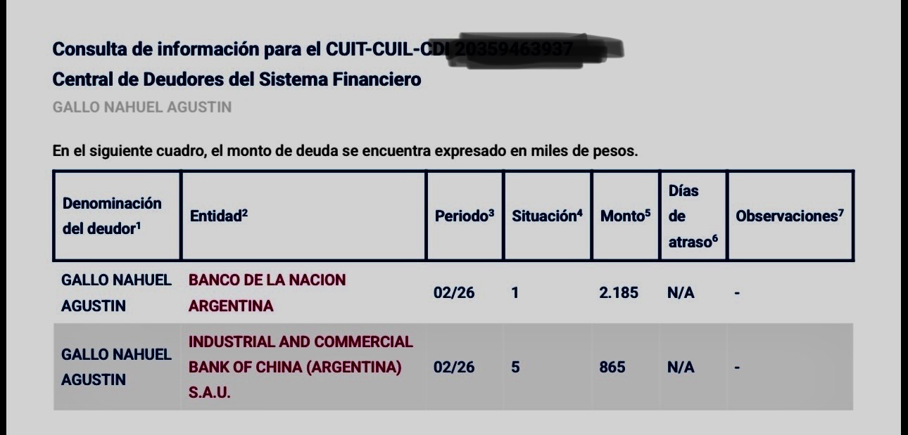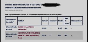 Los registros de la Central de Deudores muestran que Gallo acumuló compromisos con el Banco de la Nación Argentina por $2.185.000 y con el Industrial and Commercial Bank of China (Argentina) por $865.000. Este último caso ya en situación 5, una categoría que implica un deterioro severo de su perfil crediticio. Todo esto ocurrió mientras estaba detenido, sin capacidad real de pago.