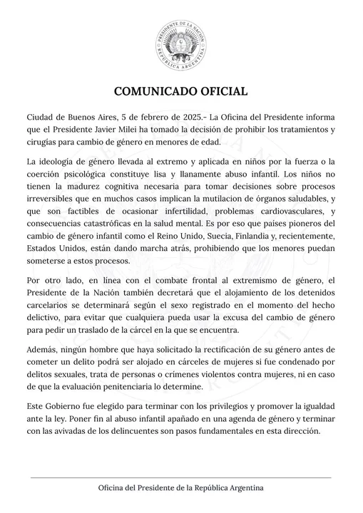 Ciudad de Buenos Aires, 5 de febrero de 2025.- La Oficina del Presidente informa que el Presidente Javier Milei ha tomado la decisión de prohibir los tratamientos y cirugías para cambio de género en menores de edad.