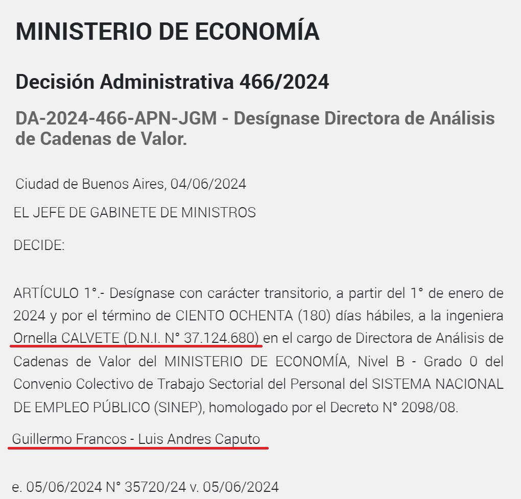 Aunque no existe parentesco ni una relación personal entre los Calvete y los Caputo, la pertenencia de Ornella a un área estratégica del Ministerio hace que el escándalo golpee directamente en la línea política del ministro. En el Gobierno remarcan que su cargo era técnico y no formaba parte del círculo de decisiones de Caputo, pero la cercanía jerárquica resulta inevitable: era una funcionaria de su ministerio, bajo su cadena de mando y con responsabilidades vinculadas a sectores sensibles de la producción.