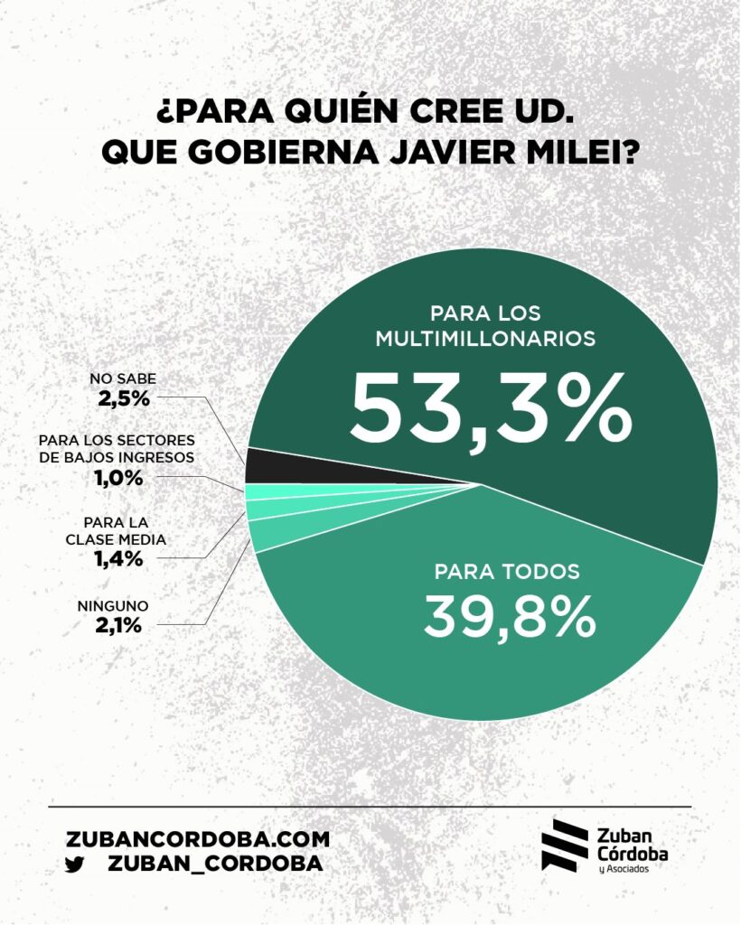Una encuesta de la encuestadora Zuban-Córdoba considera que el 53,3 por ciento de lo Argentinos cree que Milei gobierna para los multimillonarios, mientas que el 39,8 dice que lo hace para todos.