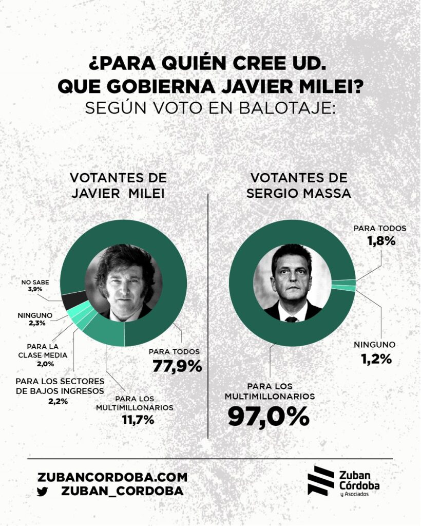 En informe además desglosa que entre los votantes del Milei en el balotage del año 2023 el 73 por ciento contestó que para todos mientras que el 11 para los ricos, y entre los votantes de Sergio Massa el 97 dijo que es para los millonarios.