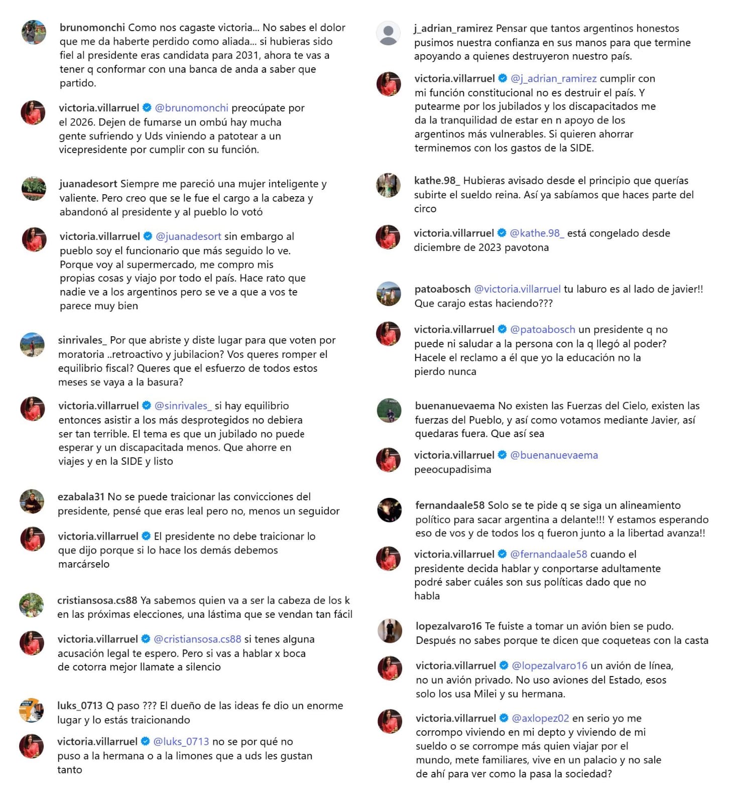 Sobra la crítica de una usuaria que le dijo sentirse desilusionada con ella, manifestó que «si el pueblo argentino se decepciona porque un vice cumple con su función, no es un chupamedias ni un servil y su objetivo es la Patria y no políticos que hoy dicen una cosa y mañana otra, entonces es un problema de los que razonan así».