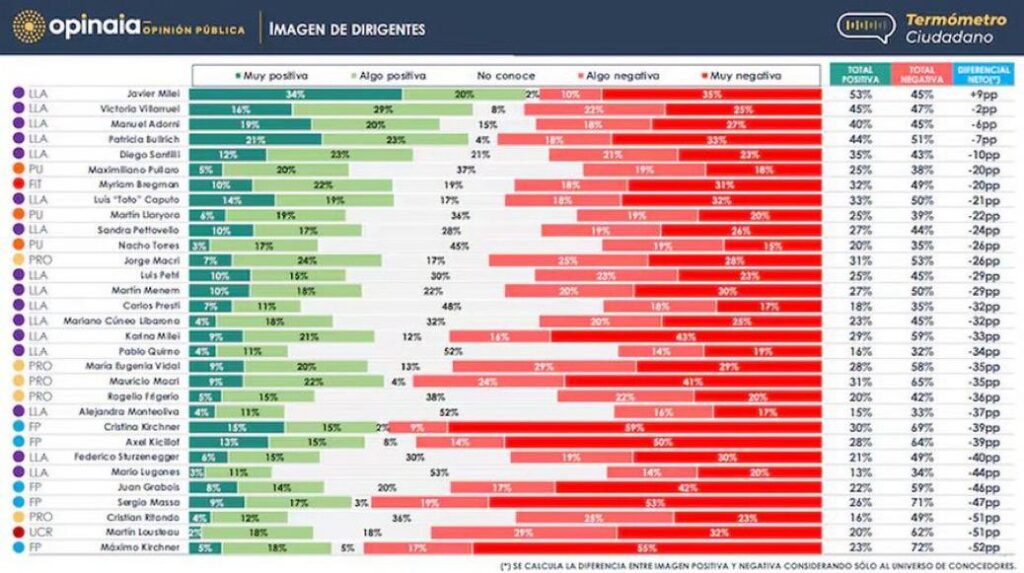 • Milei concentra una de las tasas de imagen negativa más altas del ranking, con un diferencial apenas positivo o directamente negativo según el universo de medición.